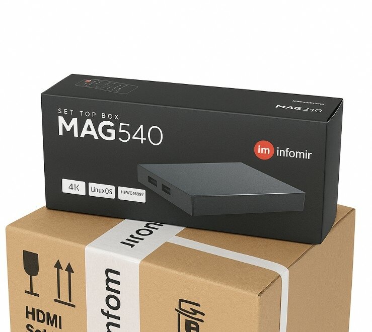 MAG540  is a new model of IPTV set-top box from Infomir. It is equipped with 1 GB of RAM and 4 GB of flash memory, which is enough for storing and playing high quality videos. MAG540 plays files with HEVC codec. This reduces the load on the network, even when it comes to streaming 4K content. Set-top box runs under Linux OS.
