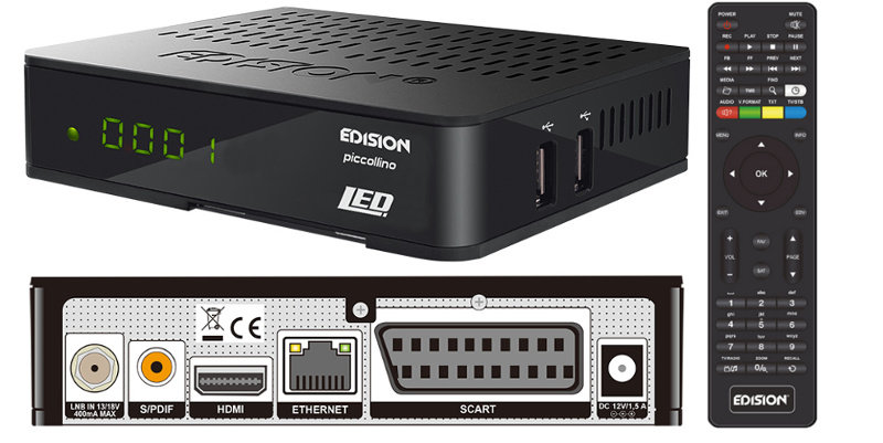Edision Picolino S2 H.265 LED is new DVB-S2 Full High definition digital satellite receiver (H.265), with 1 card reader, 1x HDMI output,1x scart output,2x usb,1x ethernet output.